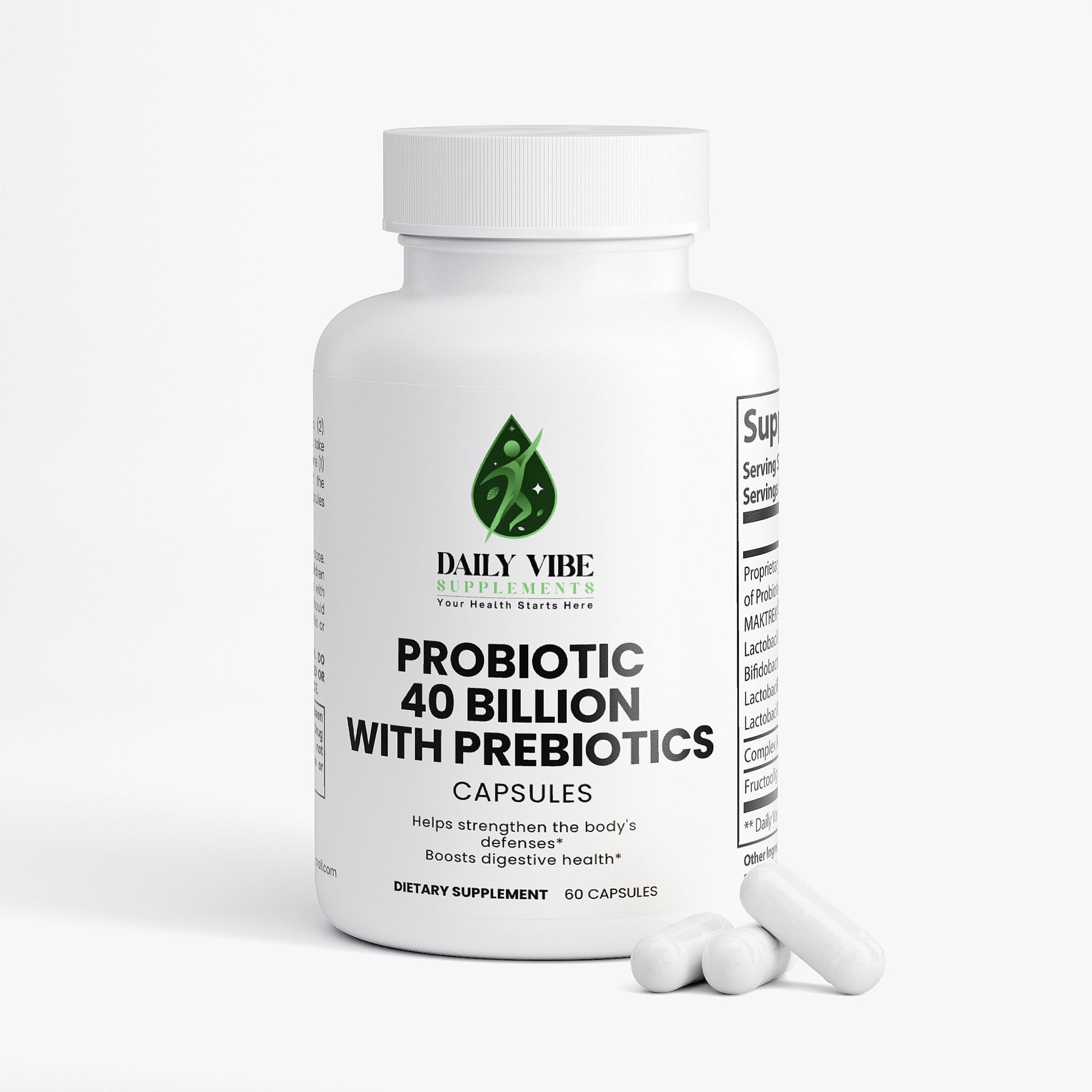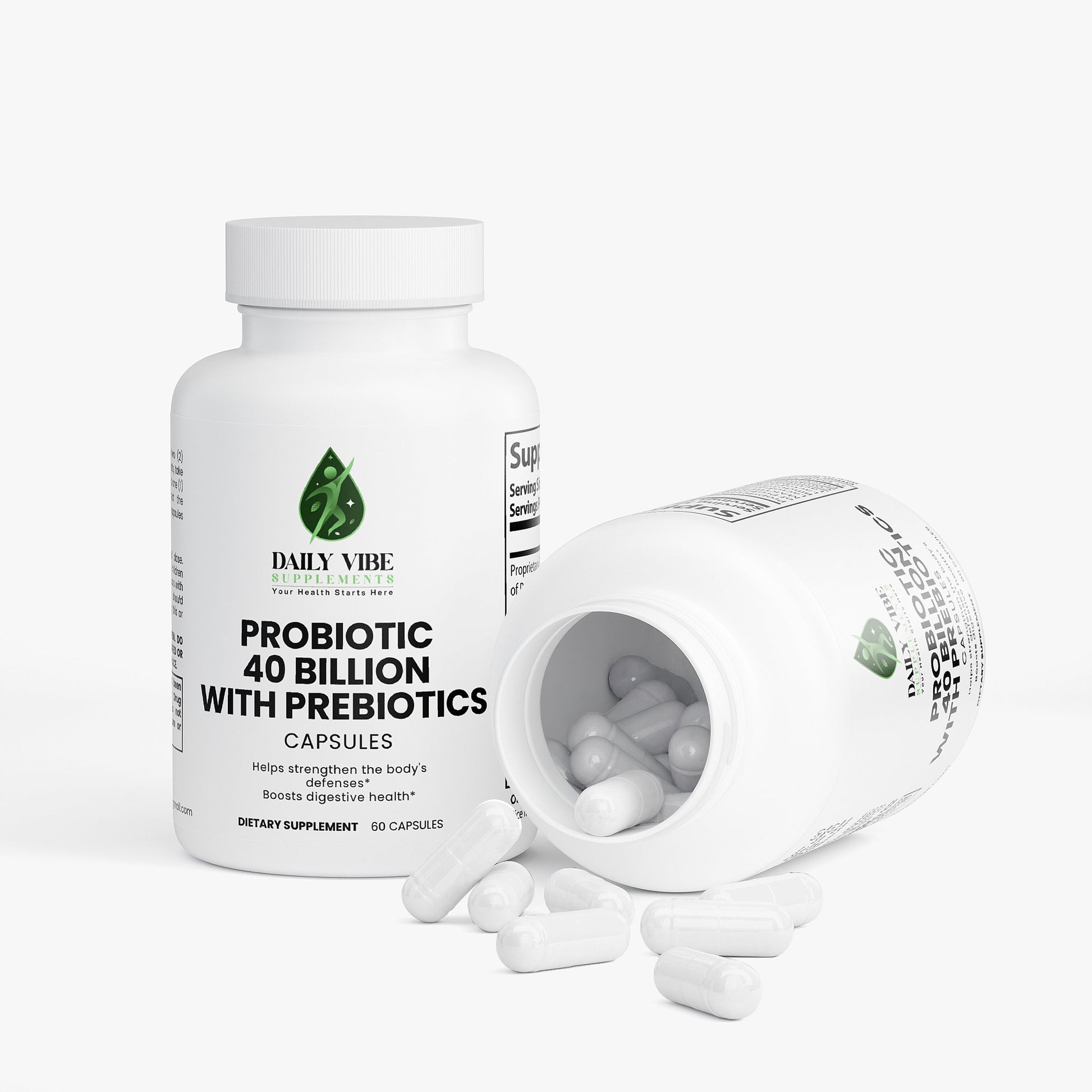 Probiotic 40 Billion with Prebiotics is a blend of four probiotic strains: Lactobacillus Acidophilus, Bifidobacterium Lactis, Lactobacillus Plantarum, and Lactobacillus Paracasei.